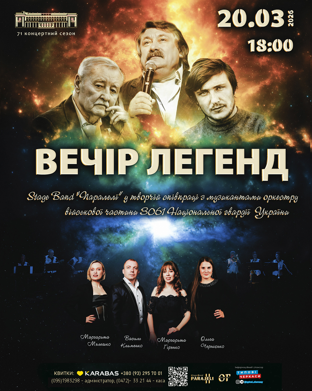 Запрошуємо на «Вечір легенд» 20 березня у Черкаській обласній філармонії, де на одній сцені зустрінуться легендарні композиції та яскраві музиканти: Stage Band «Паралелі», музиканти оркестру військової частини 3061 Національної гвардії України, а також артисти із проникливими голосами: Василь Клименко, Маргарита Гіренко, Ольга Чернієнко та Маргарита Мелешко.
