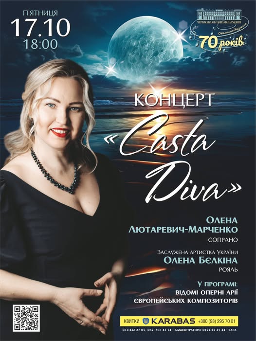Тож, 17 жовтня - чуттєвий концерт "CASTA DIVA" з нагоди Всесвітнього дня опери у Черкаській обласній філармонії, де звучатимуть шедеври італійської класичної опери, створені у часи, коли мистецтво було чи не єдиним простором свободи.