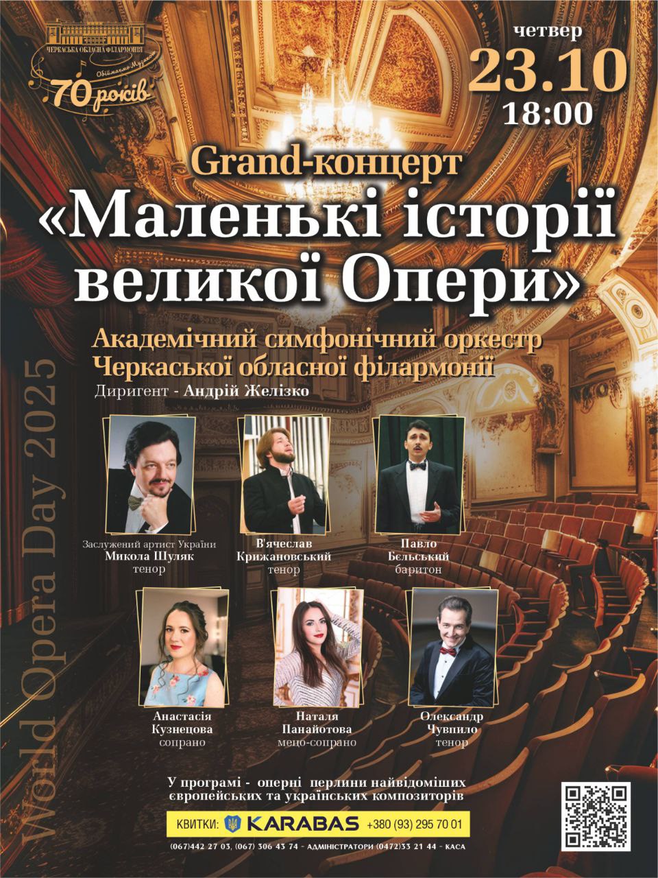 Тож, з нагоди Всесвітнього дня опери Черкаська обласна філармонія запрошує поціновувачів високого мистецтва на особливу подію — Grand-концерт «Маленькі історії великої Опери» Академічного симфонічного оркестру під диригуванням Андрія ЖЕЛІЗКА