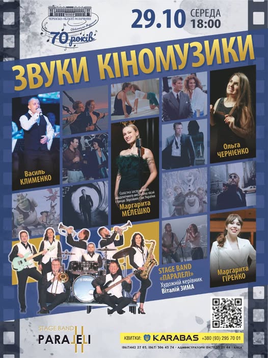 29 жовтня запрошуємо до Черкаської обласної філармонії на музичний кіновечір "ЗВУКИ КІНОМУЗИКИ" Stage band "Паралелі" під орудою Віталія ЗИМИ.