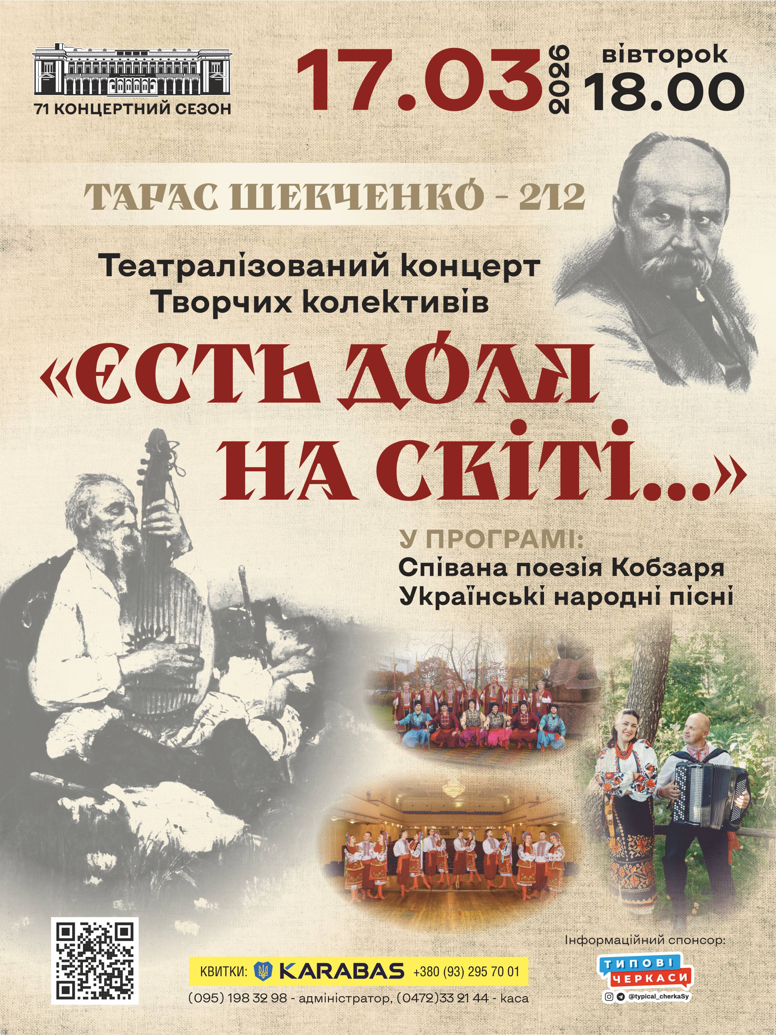Мистецька родина Черкаської обласної філармонії 18 березня о 18.00 запрошує поціновувачів поетично-пісенного українського національного мистецтва на театралізований концерт "Єсть доля на світі…»