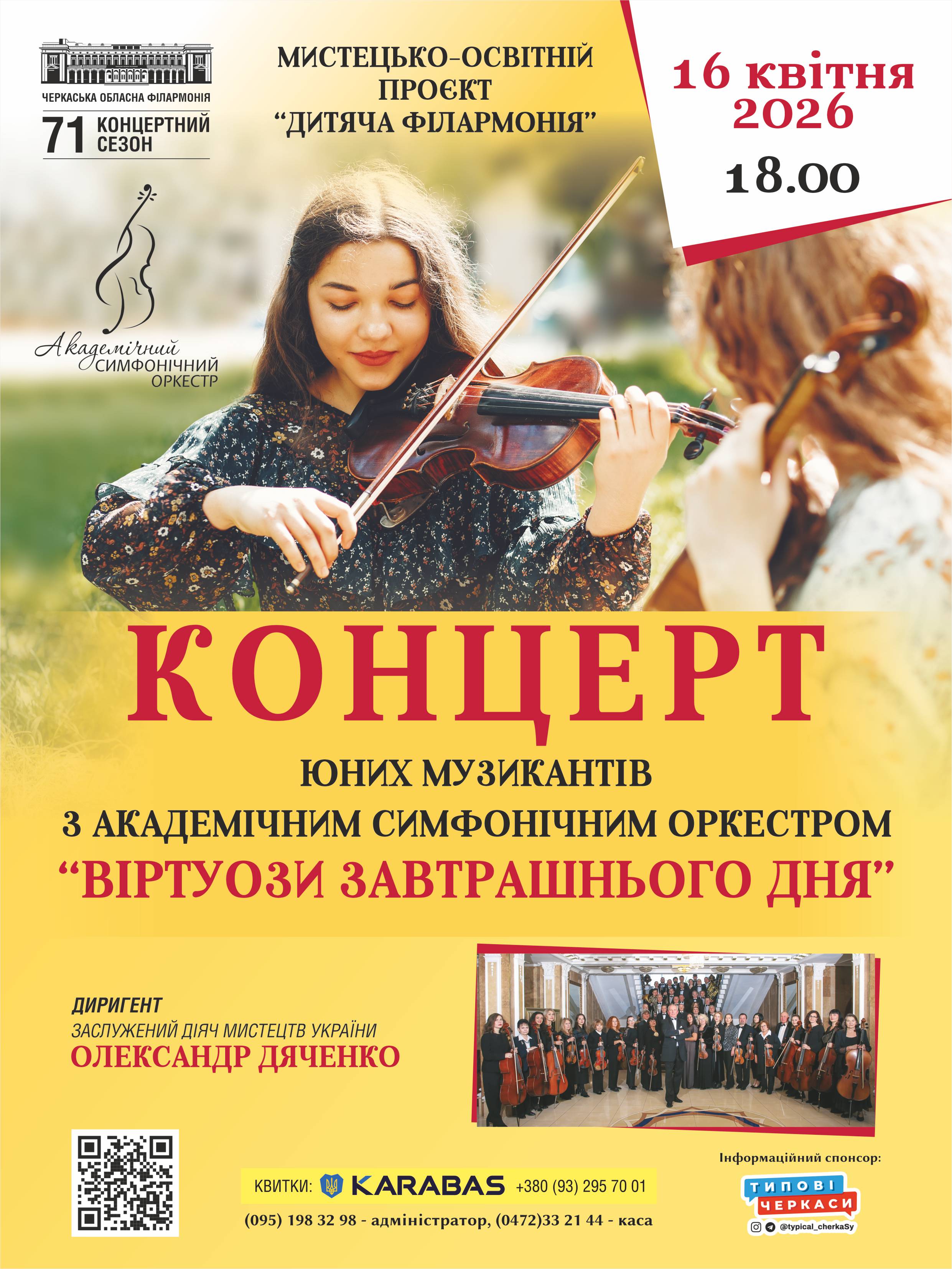 Запрошуємо на концерт “ВІРТУОЗИ ЗАВТРАШНЬОГО ДНЯ” до Черкаської обласної філармонії 16 квітня о 18:00, аби познайомитися з юними талантами, підтримати молодих виконавців? надихнутися їхньою завзятістю, креативом і вірою у мистецтво.
