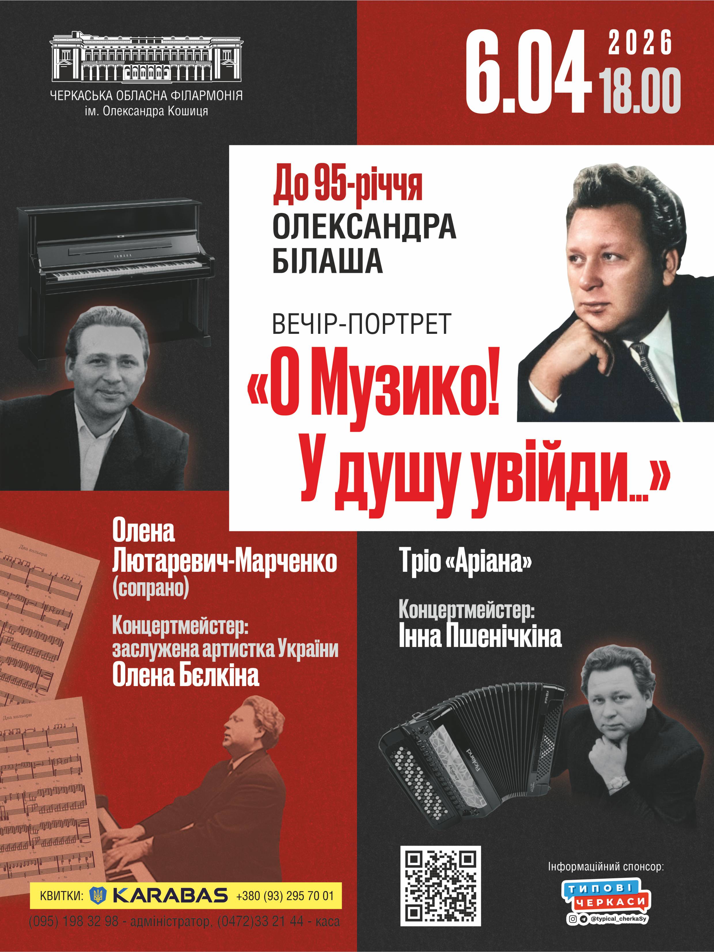 Запрошуємо 6 квітня о 18.00 на вечір-портрет «О музико! У душу увійди», присвячений 95-річчю Олександра Білаша, до Черкаської обласної філармонії ім. О. Кошиця, аби відкрити для себе музику, що ніколи не втрачає своєї актуальності.
