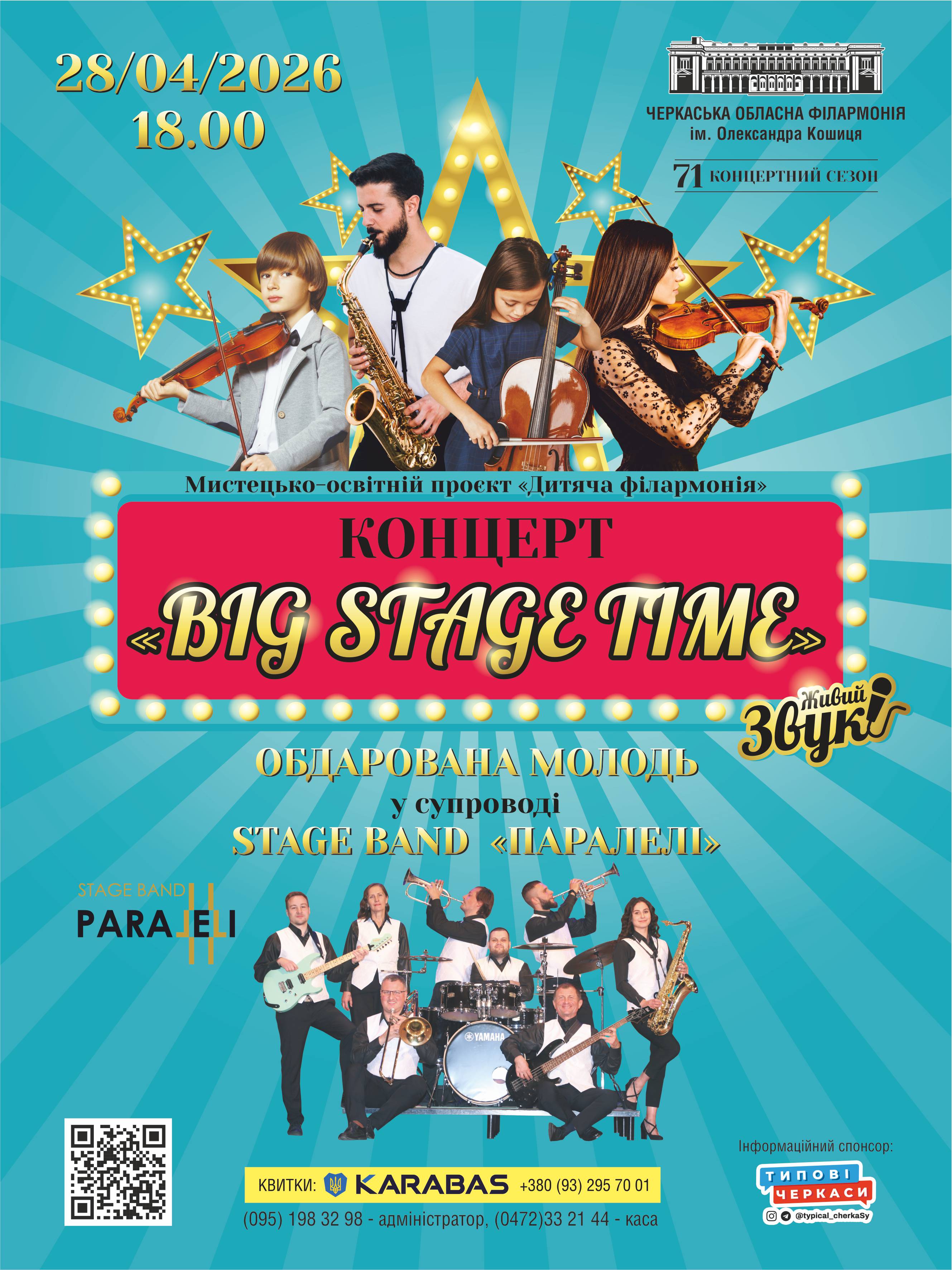 28 квітня на великій сцені Черкаської обласної філармонії імені О. Кошиця саме таку можливість втілять юні таланти разом із професійними артистами Stage Band «Паралелі» в мистецько-освітньому проєкті «Дитяча філармонія» в концерті «Big Stage Time».