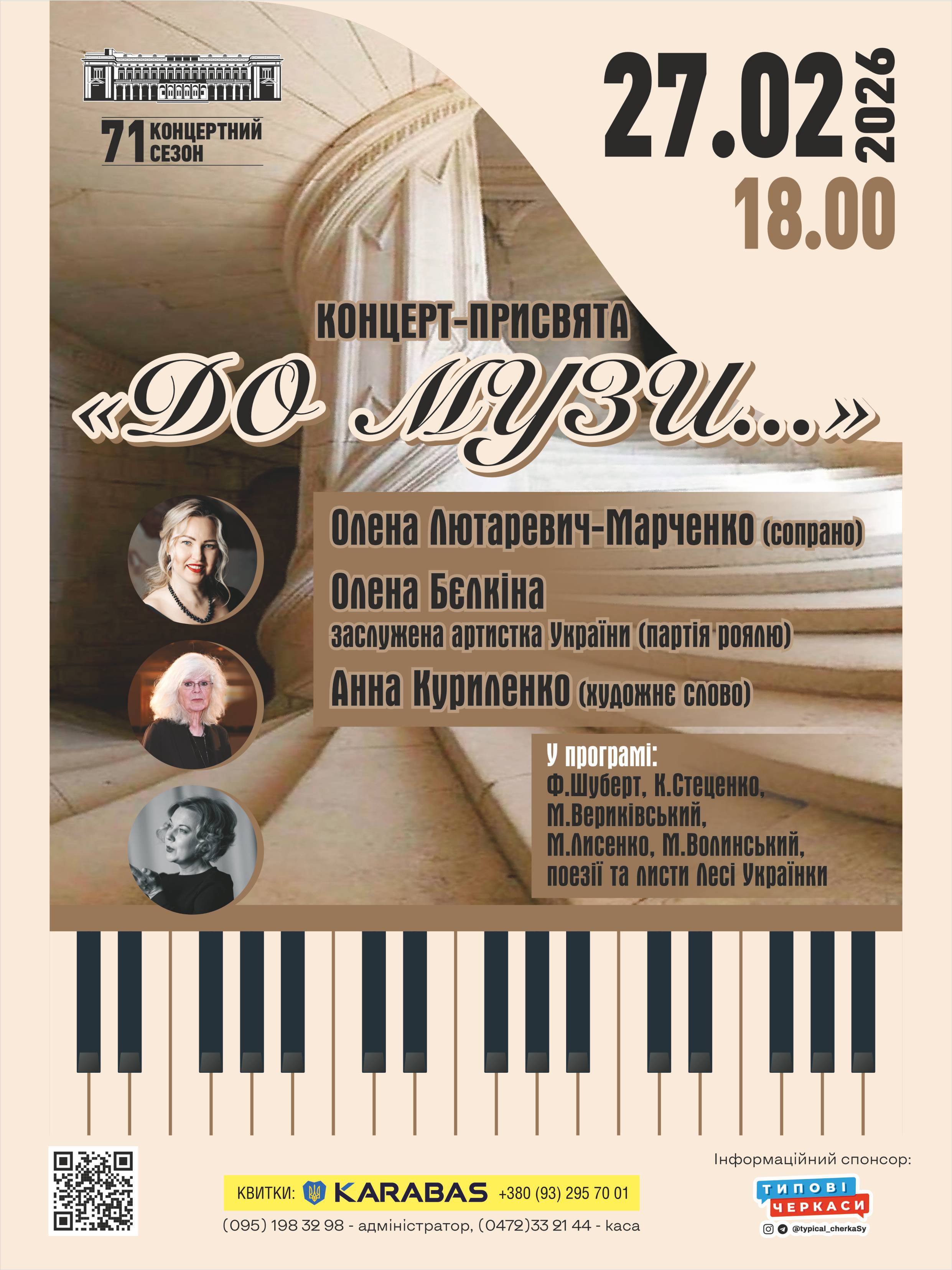 Концертний вечір ліричної музики “До музи…” з нагоди Дня української жінки, що відзначається на честь народження Лесі Українки, яка є символом незламності українських жінок, відбудеться 27 лютого о 18 год. в Черкаській обласній філармонії